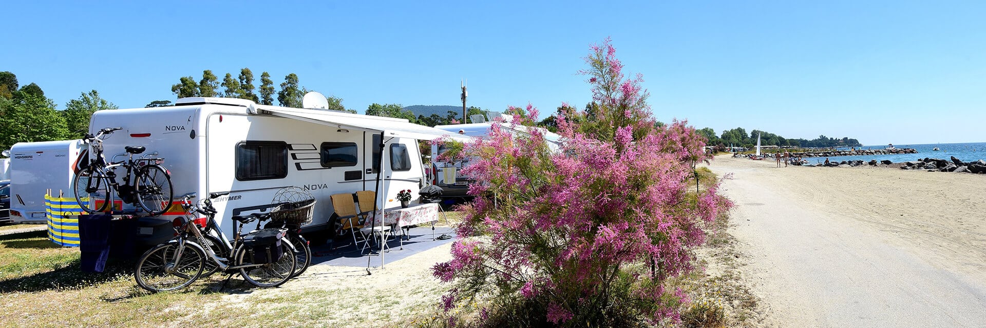 Le camping vous accueille sur 463 emplacements de 80 à 200 m2, en bord de mer ou à l’ombre de sa colline boisée.